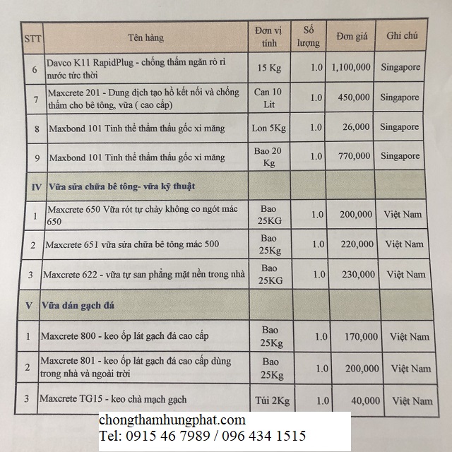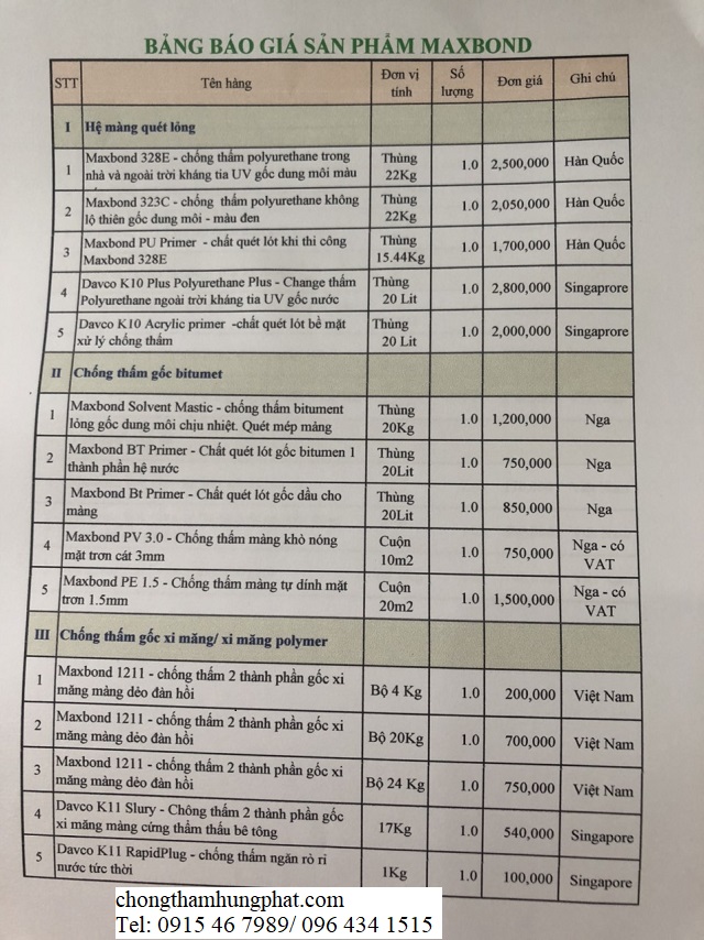 Trên đây là bảng báo giá hệ thống sản phẩm maxbond mới nhất năm 2020 tại đại lý chống thám Hưng Phát. Mọi thông tin về tài liệu sản phẩm maxbond, số lượng hàng hóa, giá dự án hãy liên hệ với chúng tôi theo