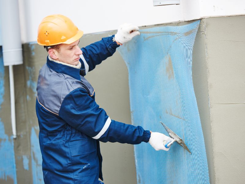 Đối với tường ngoài, lưới thủy tinh giúp gia cường lớp vữa hoặc sơn chống thấm, ngăn chặn nước mưa và độ ẩm thấm vào bên trong. Điều này giúp tăng cường độ bền cho tường, đồng thời bảo vệ công trình khỏi hiện tượng ẩm mốc.