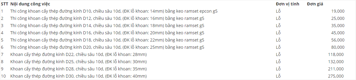 - Đơn giá có thể điều chỉnh khi chiều sâu lỗ khoan, vị trí cần khoan cấy: thép, móng, cột, dầm sàn…