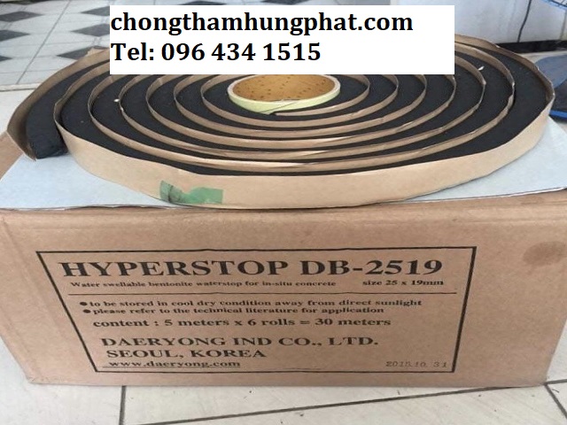 Băng trương nở hyperstop DB 2519 được chế tạo từ cao su butyl mềm dẻo kết hợp với bentonite,b hyperstop DB 2519 khi tiếp xúc với nước có tác dụng bịt kín các lỗ xốp và lỗ mao quản tại khu vực mạch ngừng thi công đồng thời tạo ra áp suất dương nội tại không cho nước thấm qua. HYPER STOP DB 2519 được đặt cách mép bê tông ngoài ít nhất 02 inch (50mm). HYPER STOP được sử dụng cho tường móng, tường tầng hầm, sàn tầng hầm, panen tường đúc sẵn, hố ga, hố thang máy, mối nối đường ống, hộp cống, bể nước…