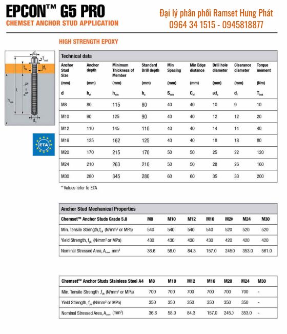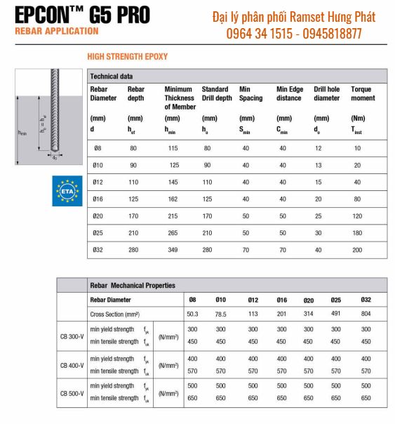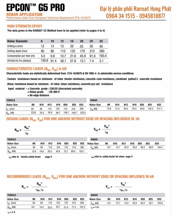 Định mức keo cấy thép Ramset Epcon G5 Pro và các thông số lực khoan cấy thép