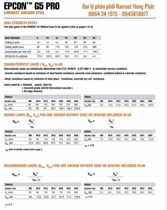Thông số lực khoan cấy bulong bằng keo Ramset Epcon G5 Pro