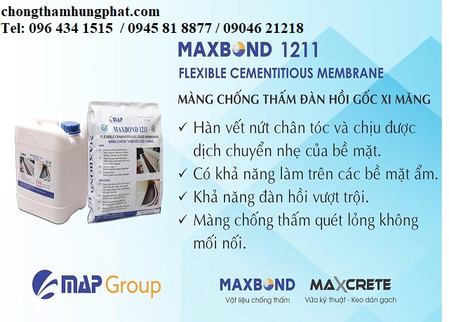 Maxbond 1211 là sản phẩm của tập đoàn Maxbond Singapore. Maxbond 1211 là màng chống thấm hai thành phần, gốc xi măng, không mối nối, quét lỏng. Đặc tính tự bảo dưỡng nhờ hơi ẩm giúp các công tác thi công tiếp theo được thực hiện nhanh chóng hơn, một khi màng chống thấm đã khô, maxbond 1211 sử dụng lý tưởng cho các khu vực ẩm ướt, các loại mái, sân lộ thiên, tường chắn đất và tầng hầm