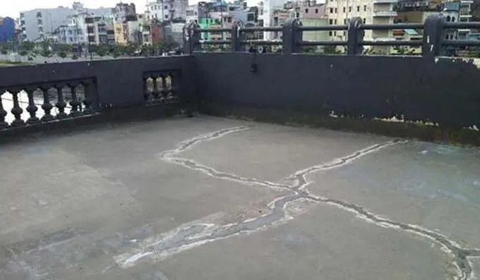 - Dùng băng keo chống thấm hoặc xi măng chống thấm để lấp đầy các vết nứt nẻ, khe hở trên sàn mái. Ở bước này, cần chú ý đến các hốc bọng, lỗ rỗ, đặc biệt là quynh khu vực lỗ thoát nướ xuyên sàn bê tông.