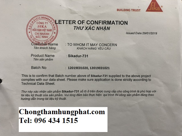 Khi quý khách hàng mua keo neo thép 731 vào bê tông tại sika Hưng Phát thì Quý khách luôn luôn yên tâm về chất lương hàng hóa. Mọi bộ sản phẩm sikadur 731 mà Hưng Phát cấp đều có chứng chỉ theo đúng số lô trên bao bì sản phẩm