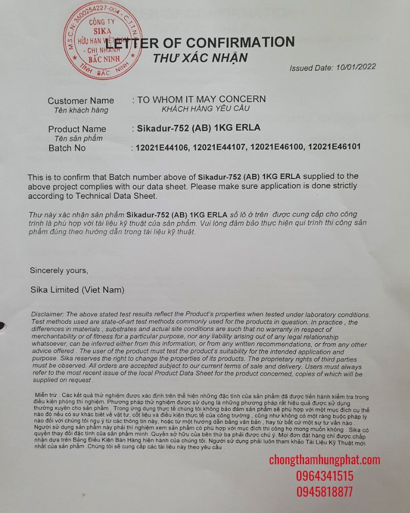 Sikadur 752 phù hợp theo tiêu chuẩn ASTM C881 – 02. Loại I. Cấp 1. Phần B + C.