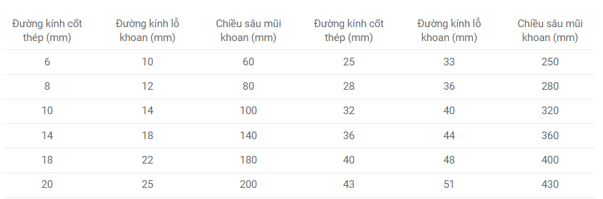 Ba loại này cần liên kết chặt chẽ với nhau để đảm bảo thép được cấy chắc chắn vào sâu trong bê tông. Bạn có thể tham khảo bảng kích thước sau: