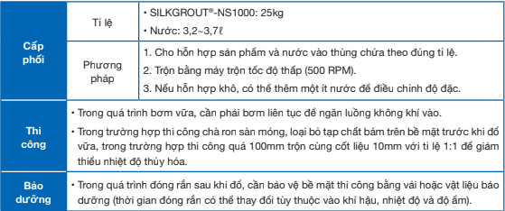 • SILKGROUT®-NS1000 là loại vữa không co ngót xi măng thủy lực trộn sẵn, dùng để gia cố và nâng đỡ các phần của kết cấu nặng như máy móc, công trình dân dụng và các công trình xây dựng yêu cầu cường độ và độ bền cao.